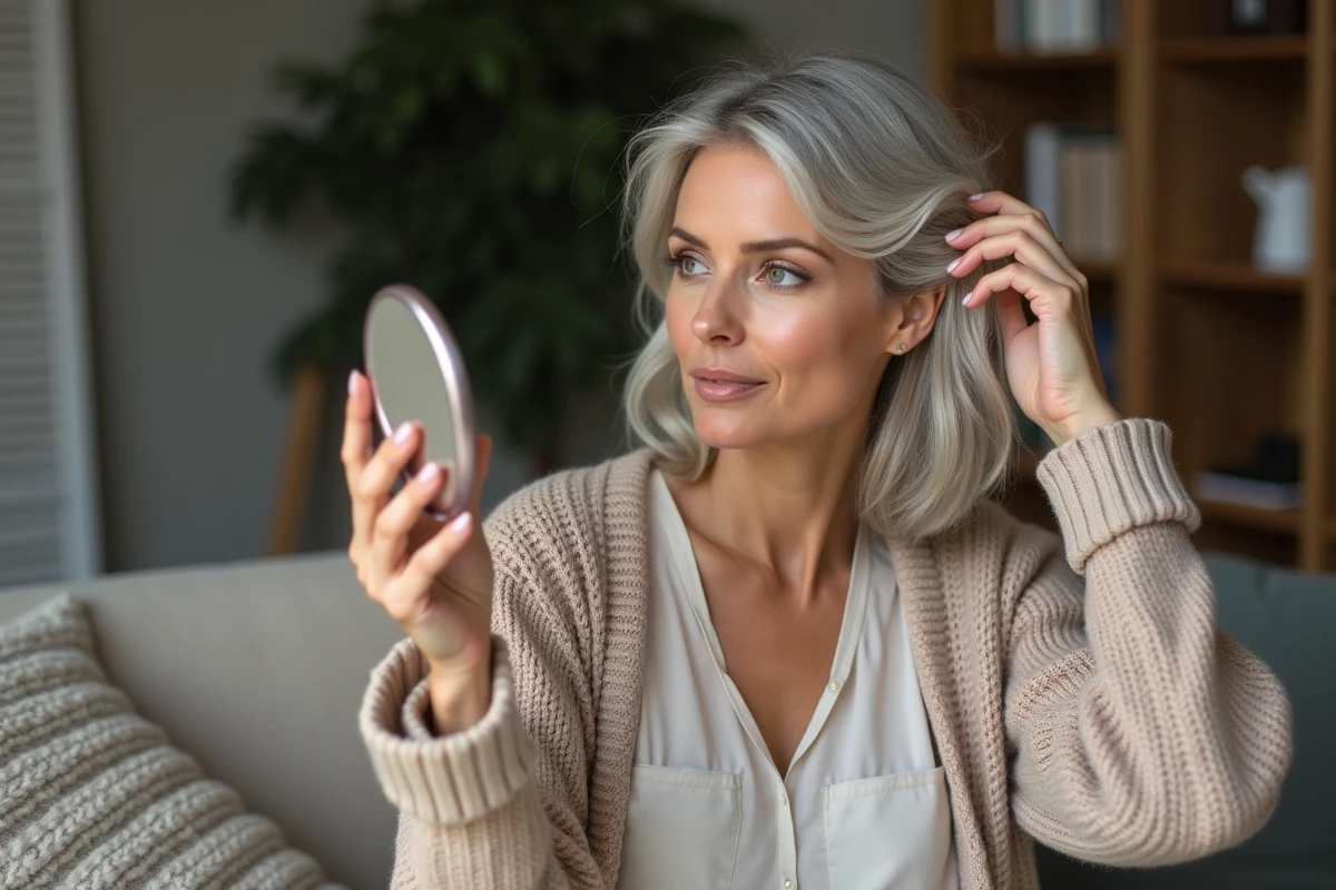 Les experts du grey blending proposent alors un mélange maîtrisé : des mèches claires pour fondre les blancs, des mèches foncées pour ramener de la profondeur, le tout appliqué avec précision. Parfois, un gloss ou un root smudge vient nuancer la racine, empêchant tout effet casque. Quand les cheveux sont déjà majoritairement poivre et sel, le balayage inversé, avec ajout de mèches brunes, assure du contraste sans rigidifier la matière.